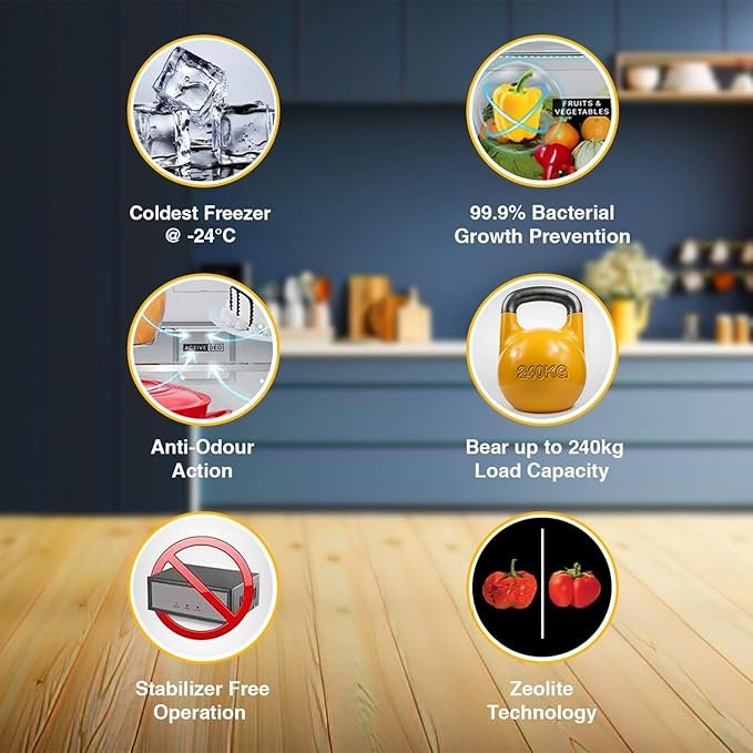 - Brand Features : Knob Inside Refrigerator, Get Ice In Up 85 Minutes, 40% Faster Bottle Cooling, Anti-Odour Action, Coldest Freezer As -24C, 99.9% Bacterial Growth Prevention, Inverter